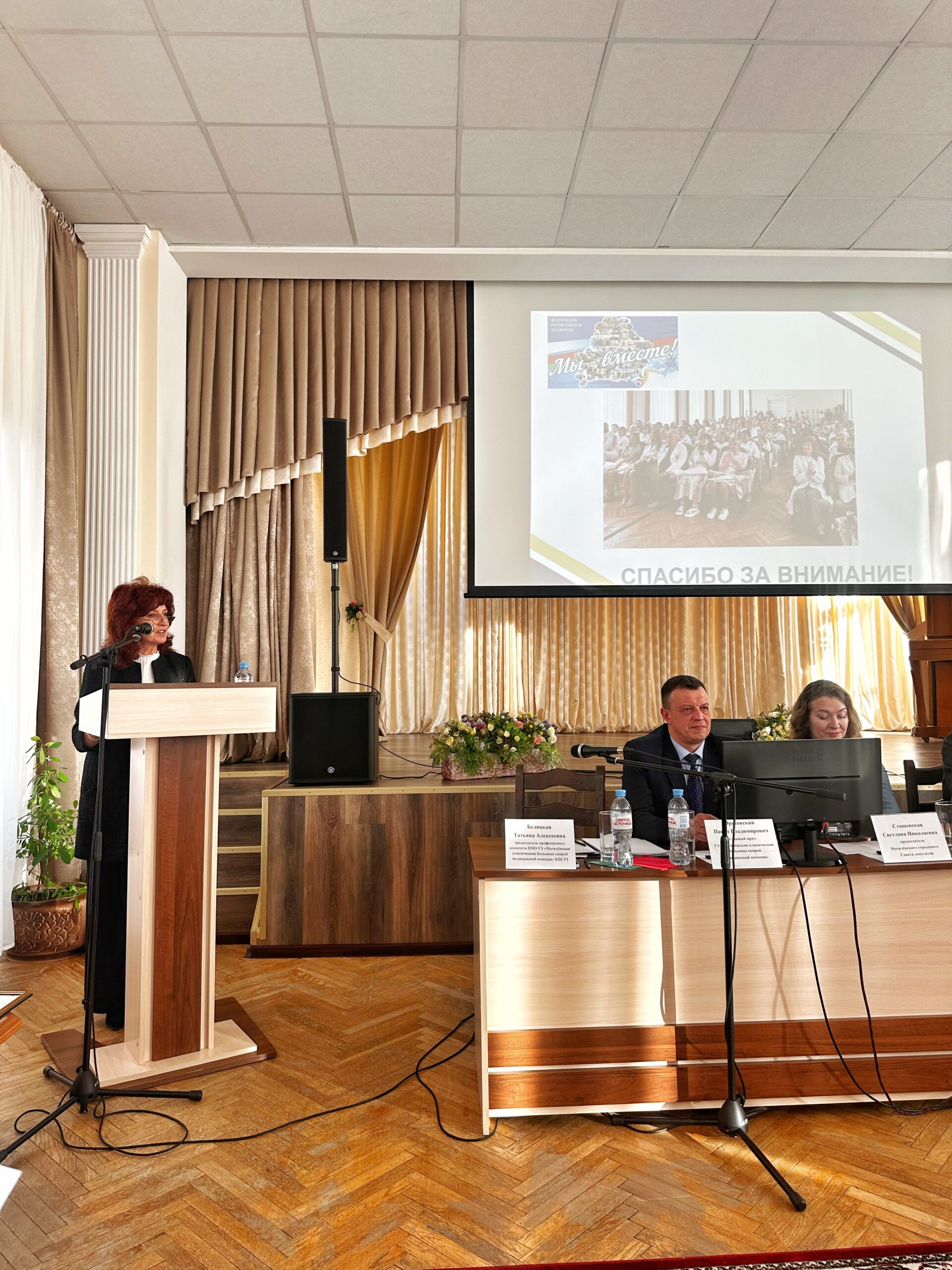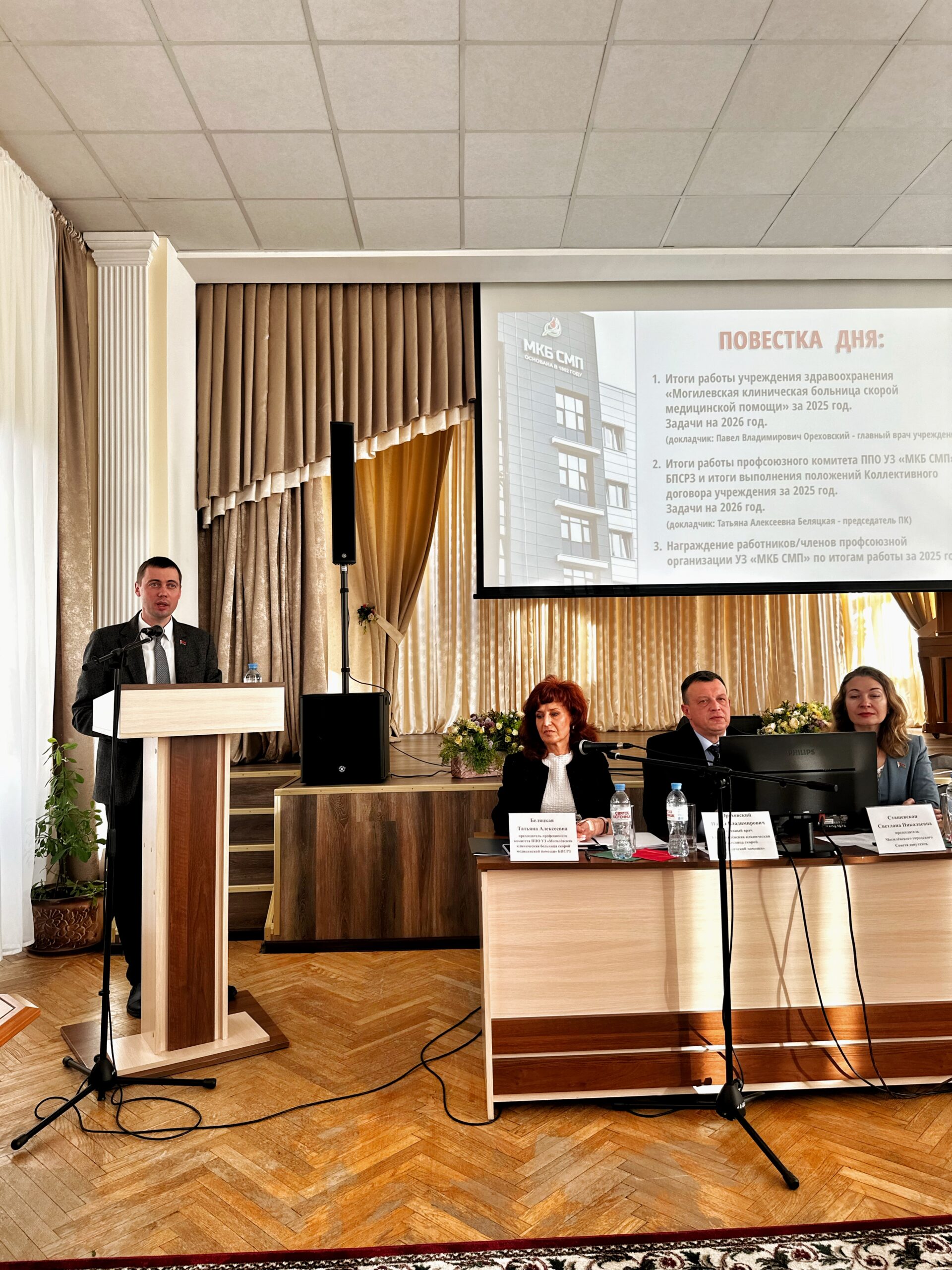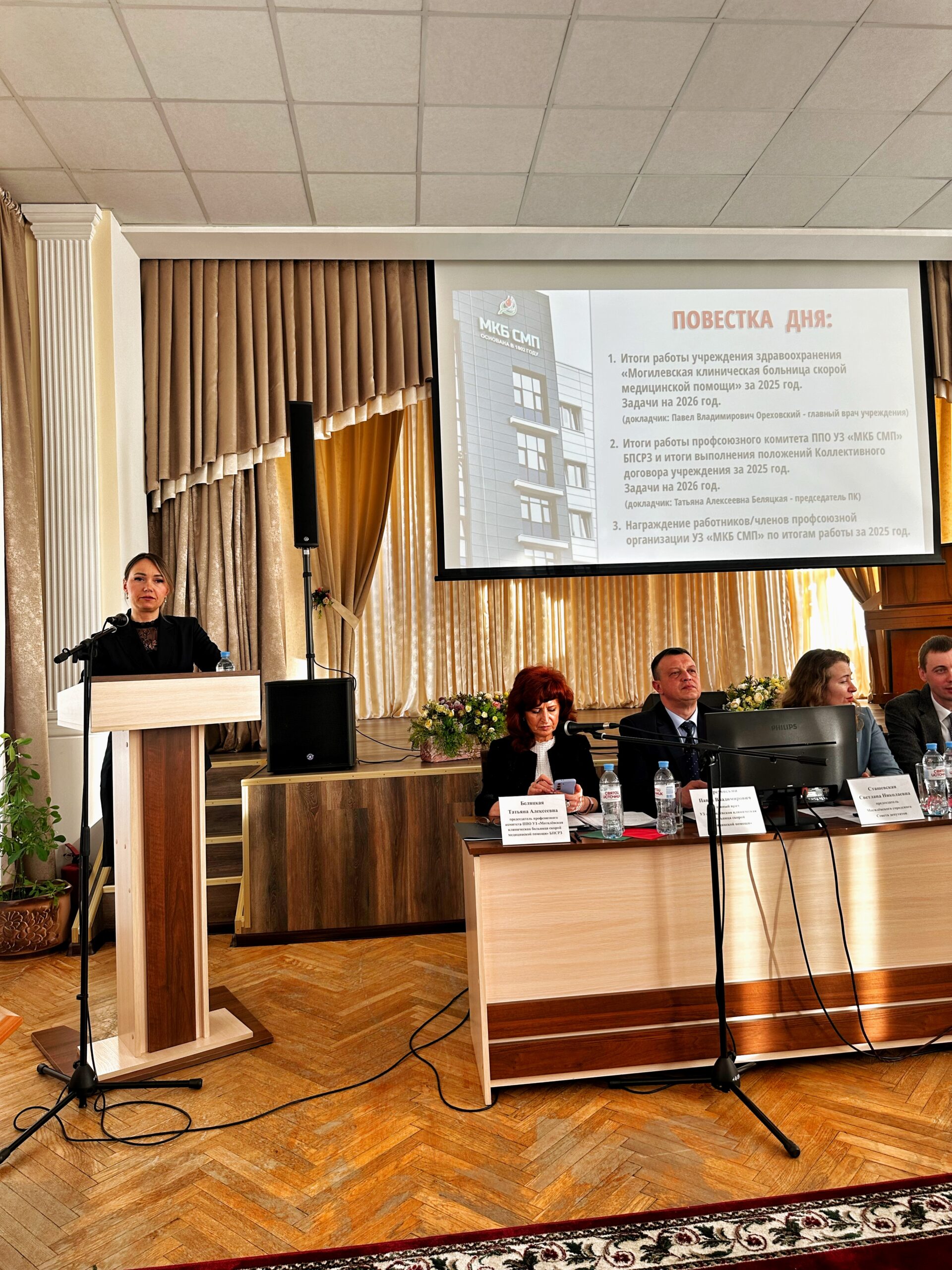 - Председатель профсоюзного комитета ППО УЗ «МКБ СМП» –Татьяна Беляцкая, которая выступила с докладом об итогах работы профсоюзного комитета, выполнения положений Коллективного договора, а также озвучила планы на 2026 год. Акцентировала внимание на приложенных усилиях администрации для создания комфортных и безопасных условиях труда работников, а также роли общественного контроля в вопросах охраны труда.